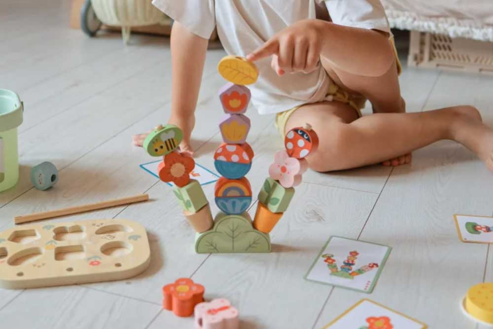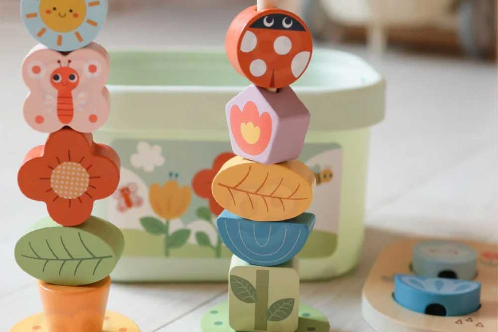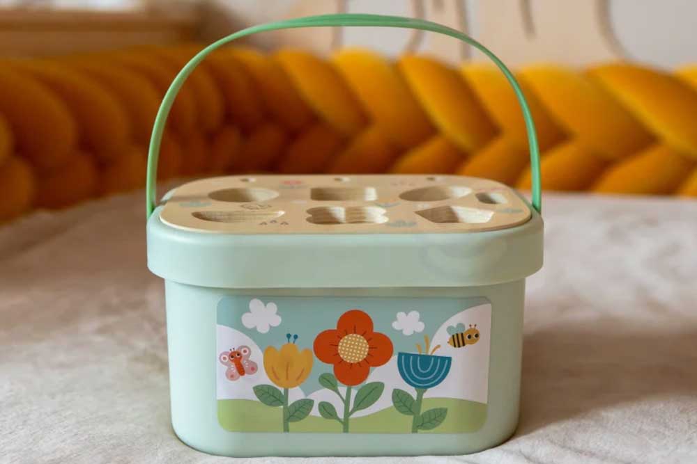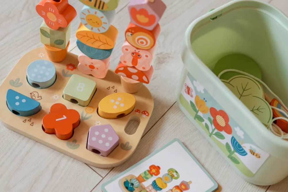 - Великі, яскраві дерев’яні елементи, зручні для дитячих ручок