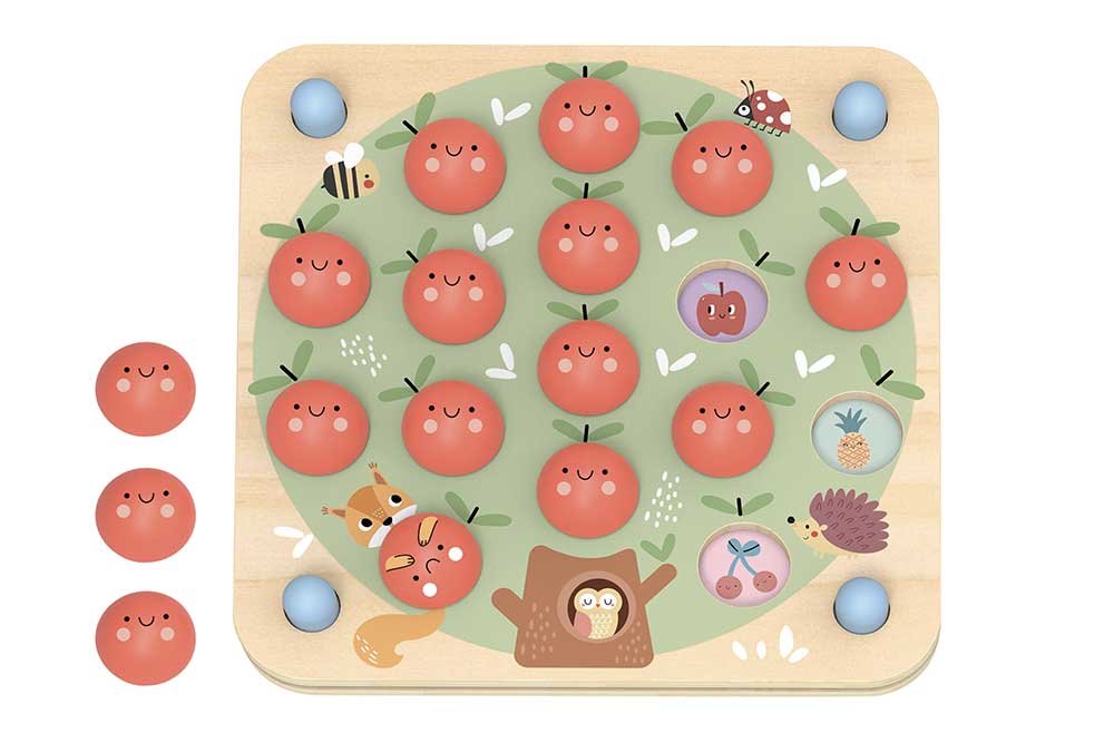 Ця гра на памʼять обов’язково сподобається малюкам завдяки чарівному дизайну: милі деревʼяні яблучка чекають, щоб їх “зібрали” з дерева. У комплект входить змінна вкладка із зображеннями тваринок або фруктів — саме їхнє розташування потрібно запамʼятати на початку гри.