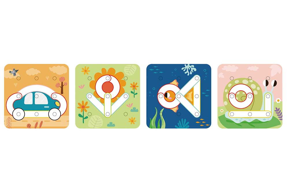 Завдання дитини — правильно розташувати різнокольорові дерев’яні деталі на ігровому полі, орієнтуючись на кольорові підказки на картках. Такий підхід сприяє розвитку логіки, пам’яті, уваги та візуального сприйняття.