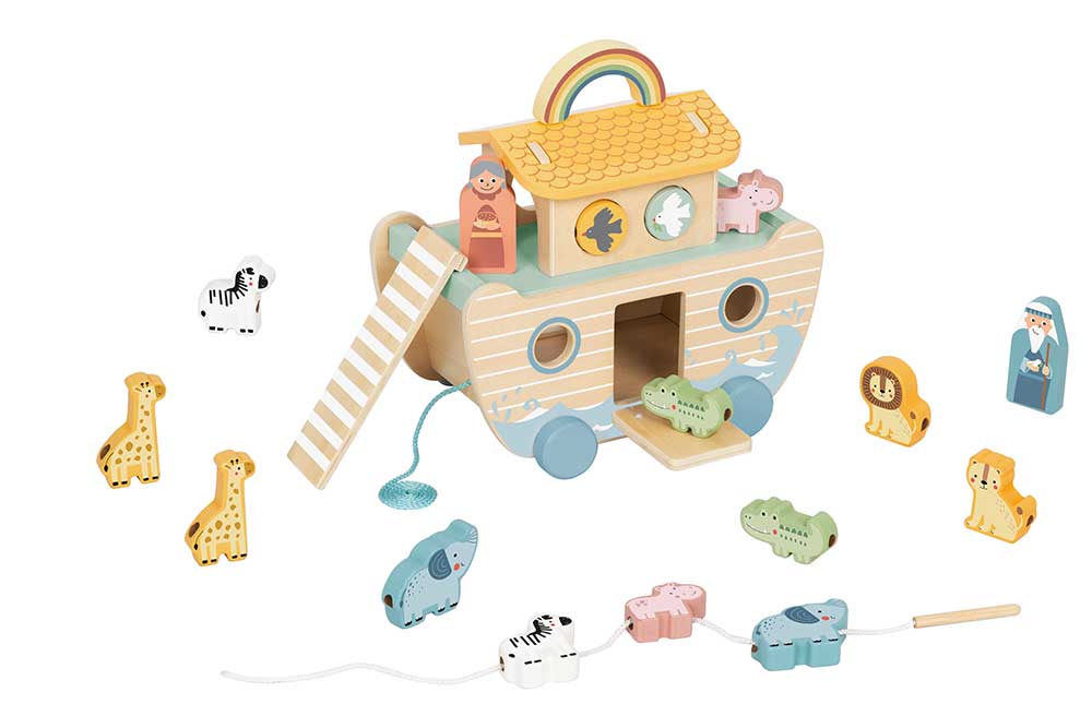 А завдяки довгій мотузці, ковчег можна тягнути за собою — іграшка подорожує разом із дитиною по всьому дому, сприяючи фізичній активності та веселій грі.