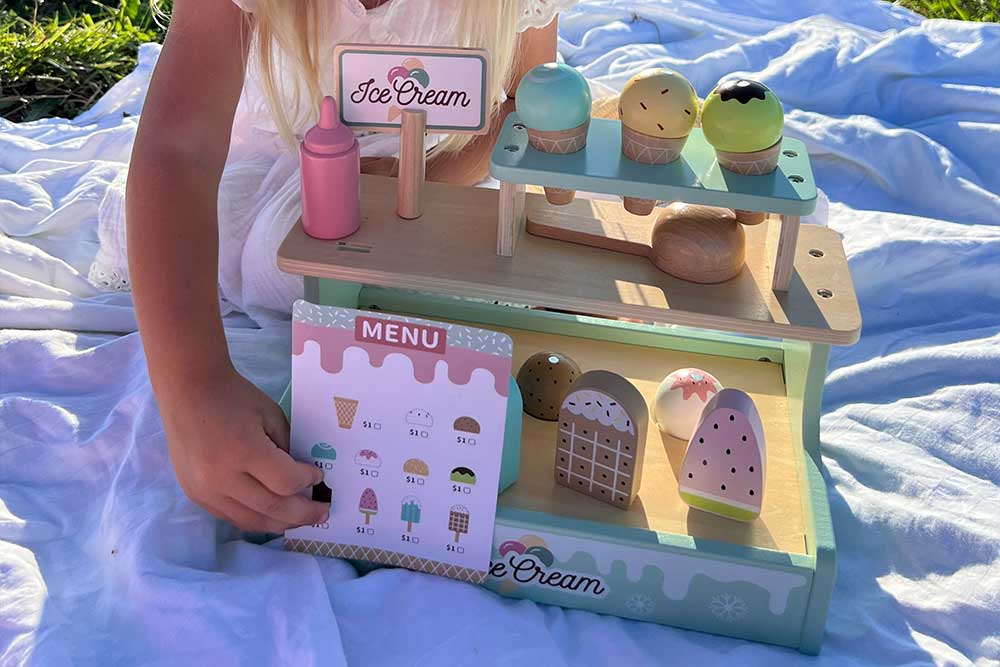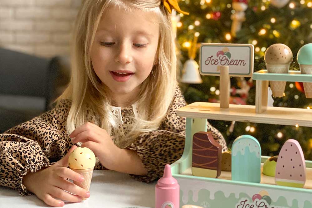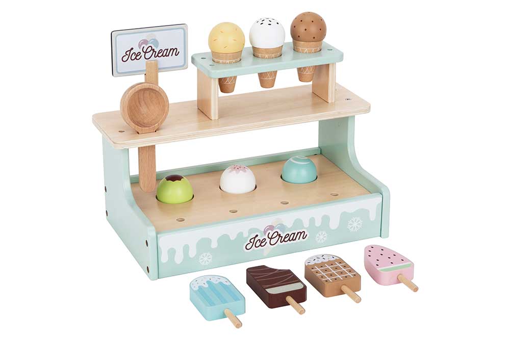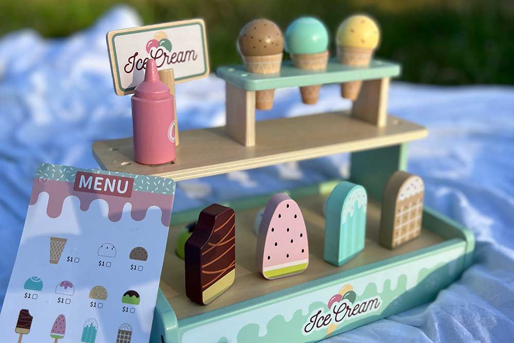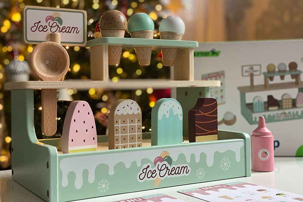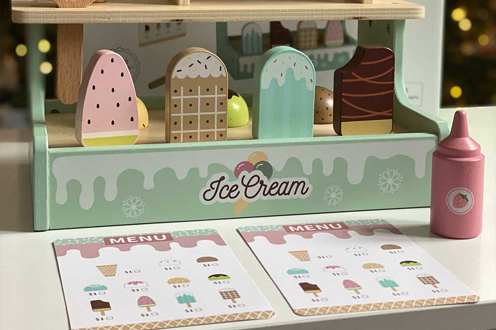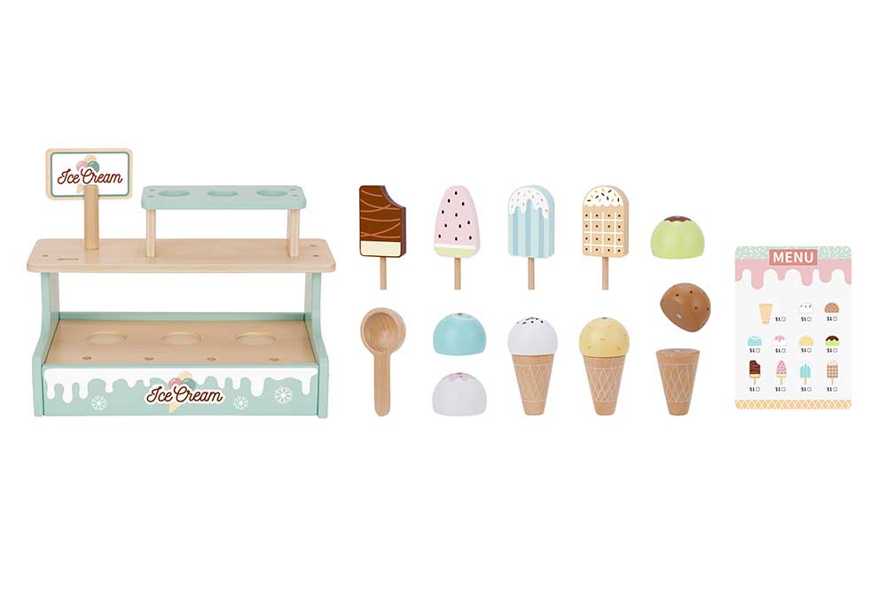 У наборі представлений великий вибір морозива на будь-який смак: ескімо на паличці, морозиво у вафельному ріжку, топінги — усе як у справжньому кафе! Завдяки магнітному кріпленню, кульки морозива легко фіксуються на ріжку, додаючи реалістичності процесу гри.